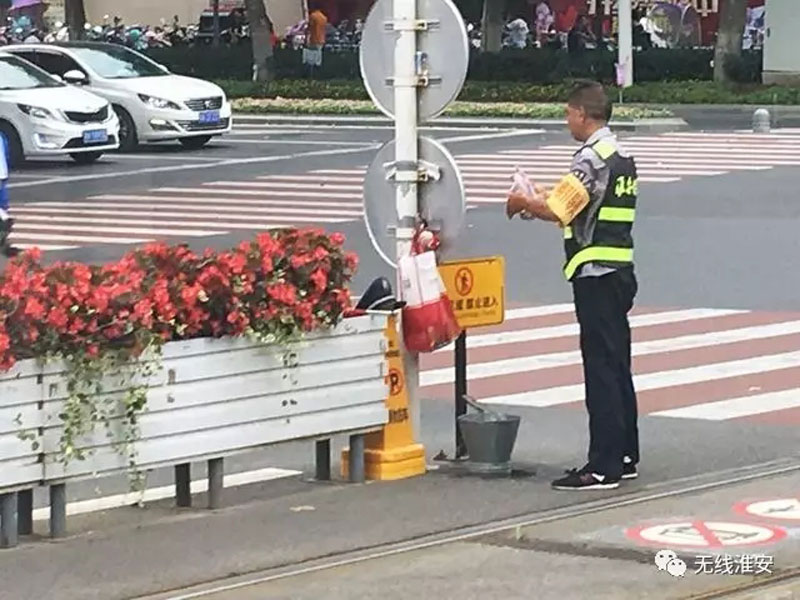 照片中,一位有軌電車保安隊員在酷暑中堅守崗位,他的腳邊放著一只小鐵桶,執(zhí)勤過程中實在熱了,他就用毛巾擰一把擦汗降溫。市民周先生被這一幕深深感動,遠(yuǎn)遠(yuǎn)的拍下了幾張照片。